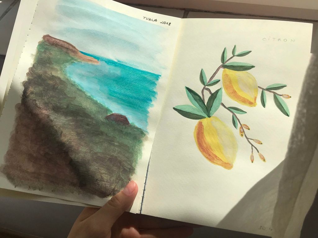 Ei bine, eu am avut o poveste mai lungă cu pictura; a fost un hobby care m-a însoțit în anii copilăriei și care s-a pierdut undeva pe drum. Până anul acesta, când l-am regăsit întâmplător, în timpul perioadei de izolare. Povestea este cam așa: am descoperit pe Instagram o tipă, pe nume Angela McKay (pe care o recomand cu căldură), care pictează într-un stil atât de naiv și pur că m-a făcut să mă îndrăgostesc instant de lucrările ei. Am aflat că folosea guașe și mi-am amintit că aveam și eu un set de guașe chinezești, uitate și prăfuite prin debara. Și atunci s-a creat legătura în mintea mea: era momentul să pictez din nou. Dar fără prea multă presiune și pregătire, ci pur și simplu pe un caiet de schițe micuț, primit de la o prietenă, cu vechile culori și pensule și cu speranța că mă va prinde. Și m-a prins. Mi-am propus să reproduc imagini din vacanțe, dar am exersat și cu diverse fructe sau flori pentru a îmi reintra cât de cât în mână. Mi-am transformat biroul într-un „mini-atelier”, cum îmi plăcea să îl numesc.
