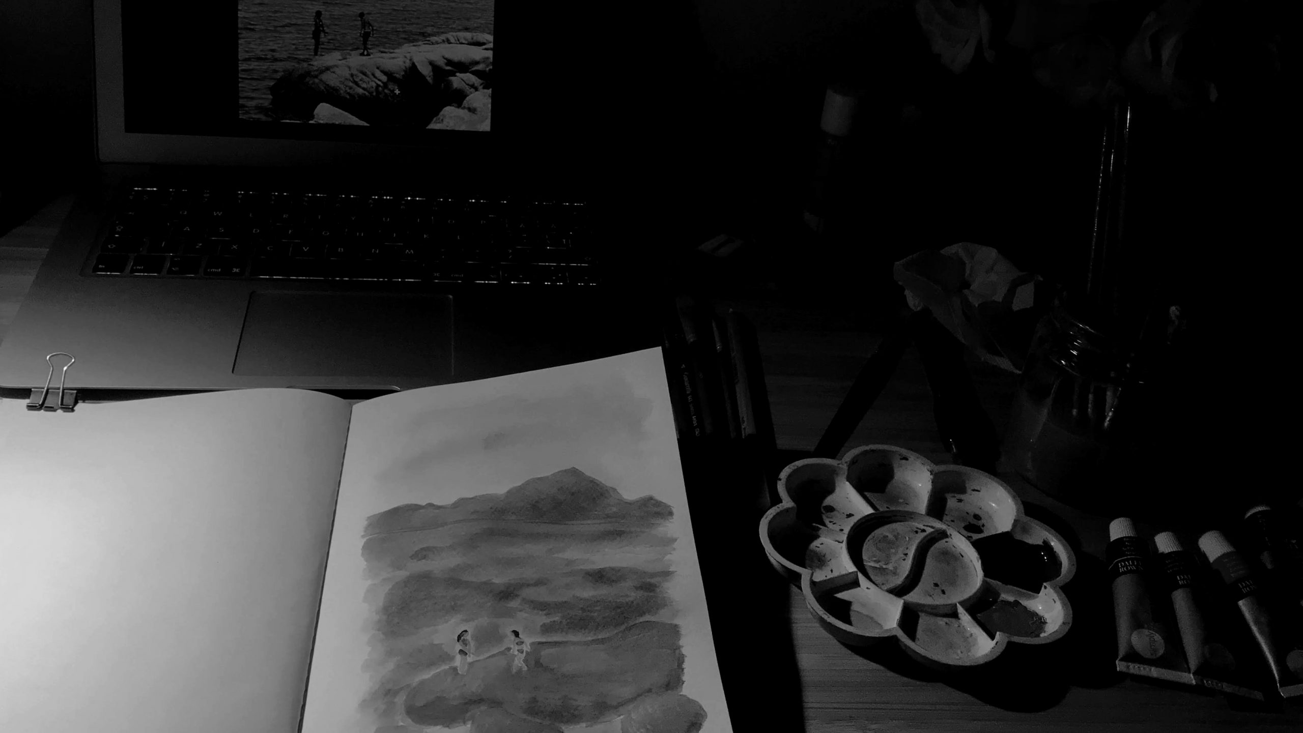 Ei bine, eu am avut o poveste mai lungă cu pictura; a fost un hobby care m-a însoțit în anii copilăriei și care s-a pierdut undeva pe drum. Până anul acesta, când l-am regăsit întâmplător, în timpul perioadei de izolare. Povestea este cam așa: am descoperit pe Instagram o tipă, pe nume Angela McKay (pe care o recomand cu căldură), care pictează într-un stil atât de naiv și pur că m-a făcut să mă îndrăgostesc instant de lucrările ei. Am aflat că folosea guașe și mi-am amintit că aveam și eu un set de guașe chinezești, uitate și prăfuite prin debara. Și atunci s-a creat legătura în mintea mea: era momentul să pictez din nou. Dar fără prea multă presiune și pregătire, ci pur și simplu pe un caiet de schițe micuț, primit de la o prietenă, cu vechile culori și pensule și cu speranța că mă va prinde. Și m-a prins. Mi-am propus să reproduc imagini din vacanțe, dar am exersat și cu diverse fructe sau flori pentru a îmi reintra cât de cât în mână. Mi-am transformat biroul într-un „mini-atelier”, cum îmi plăcea să îl numesc.
