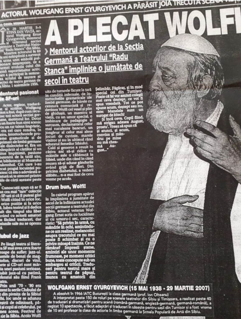Pe 29 martie, anul 2007, Sibiu, Wolfi pentru mine, Opa pentru cei foarte apropiați și Wolfgang Ernst Gyirgyevich pentru teatru, a plecat de lângă noi la 69 de ani, lăsând doar urmele trecutului să ne mai recite pe scenă. Îmi aduc aminte și acum ziua în care l-am văzut dormind verșnic.